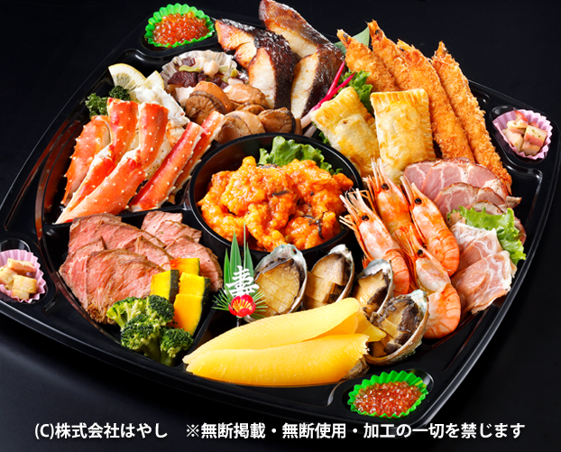 | 壱の重 | 北海道産数の子・特選紅白蒲鉾・煮帆立(噴火湾産)・紅白生酢(北海道産)・北海しまえび(厚岸産)・タラバガニ・北海道産黒豆(金粉・丁呂貴)・特製う巻・北海道産いくら醤油漬け | 弐の重 | 特製甘煮(里芋、筍、人参、椎茸、高野とうふ、てまり麩、蕗)・道産牛ロースト(北海道産)彩野菜添え・江別産山わさびソース・百合根甘露煮(剣淵産)・葉付き金柑・栗きんとん(甘栗のせ)・鯨ベーコンと香味葱・大海老のチリソース煮 |