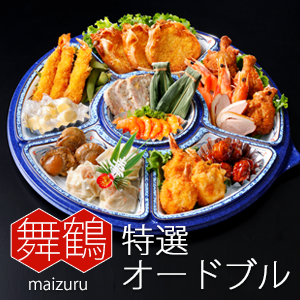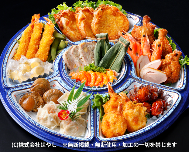 | お品書き | 姫蟹甲羅揚げ・枝豆・海老フライ・キャンディチーズ・煮帆立・帆立焼売・蟹爪クリームフライ・合鴨スモーク・骨付き手羽唐揚げ・祝海老・笹よもぎ餅・海老チリソース・ミートローフ・肉団子 |