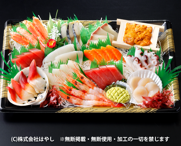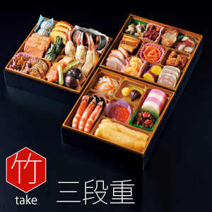 | 参の重 | 道産つぶ煮・胡桃黒糖・伊達巻き・黒豆・鮑の酒蒸し・花餅手毬・真鯛西京焼・サーモン花・鯨ベーコン・牛肉牛蒡巻き |