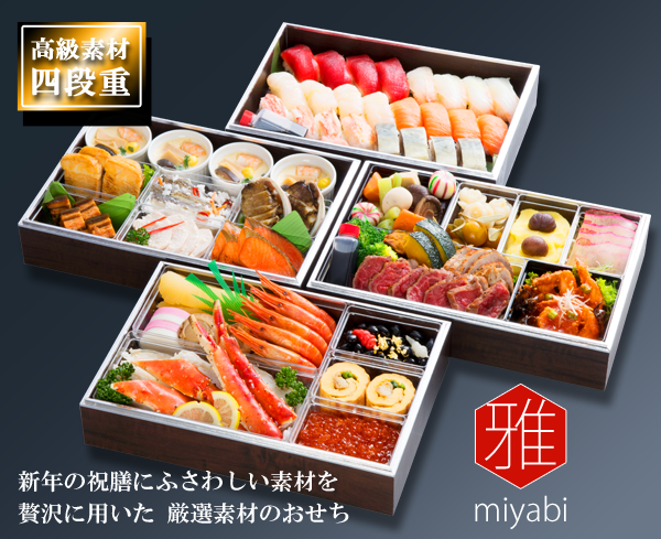 | 概要 | ;重箱サイズ/外寸たて21cm×よこ30cm×高さ5.5cm [ 紙製四段重・全26品・盛付けた状態でお渡し致します ] アレルゲン表記:大豆・小麦・えび・かに・卵・乳・いくら・さけ・あわび・さば・鶏肉・牛肉・豚肉 |